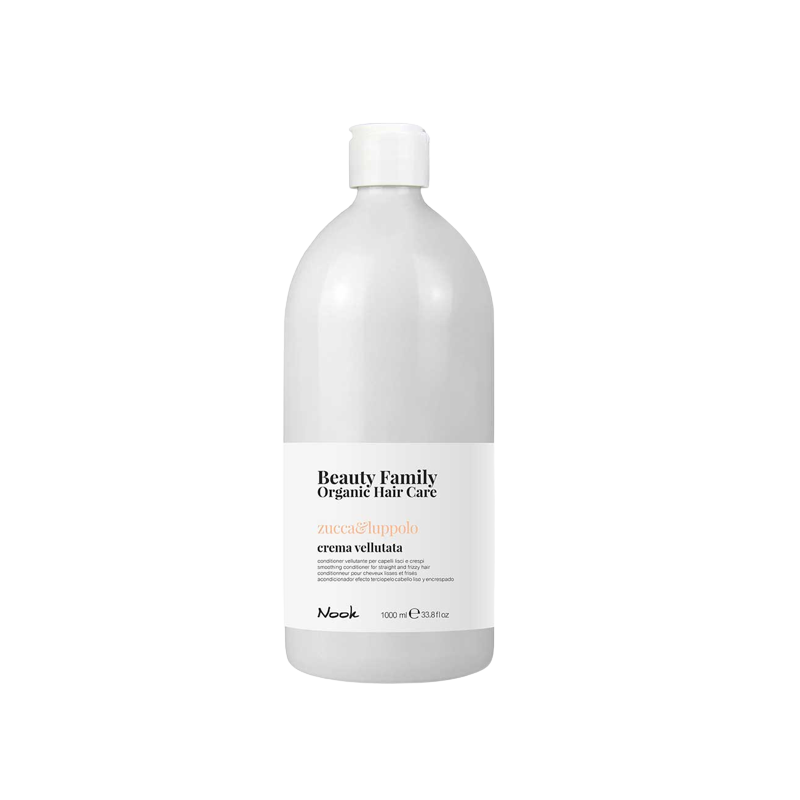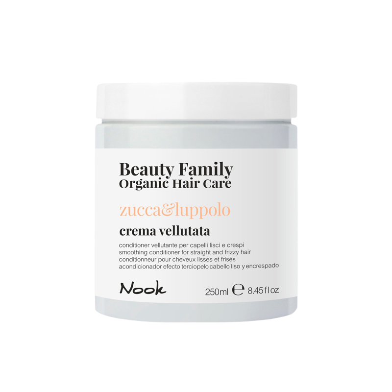 Cuida tu cabello de la manera mas natural gracias a Nook Beauty Family Organic Hair Care. Este acondicionador previene el encrespado ademas de facilitar el alisado del cabello. Gracias a sus extractos naturales de calabaza y lupulo disfrutaras de un cuidado increible para tu pelo. El extracto natural de Calabaza es rico en zinc, potasio, calcio, magnesio, hierro, antioxidantes y vitaminas, la calabaza previene el envejecimiento, protege de los efectos del sol proporcionando tambien un efecto antiencrespado. Y con la ayuda del lupulo tonifica el cuero cabelludo y le aporta vigor. Regula la caspa con su acción purificante y ralentiza la caída del cabello.