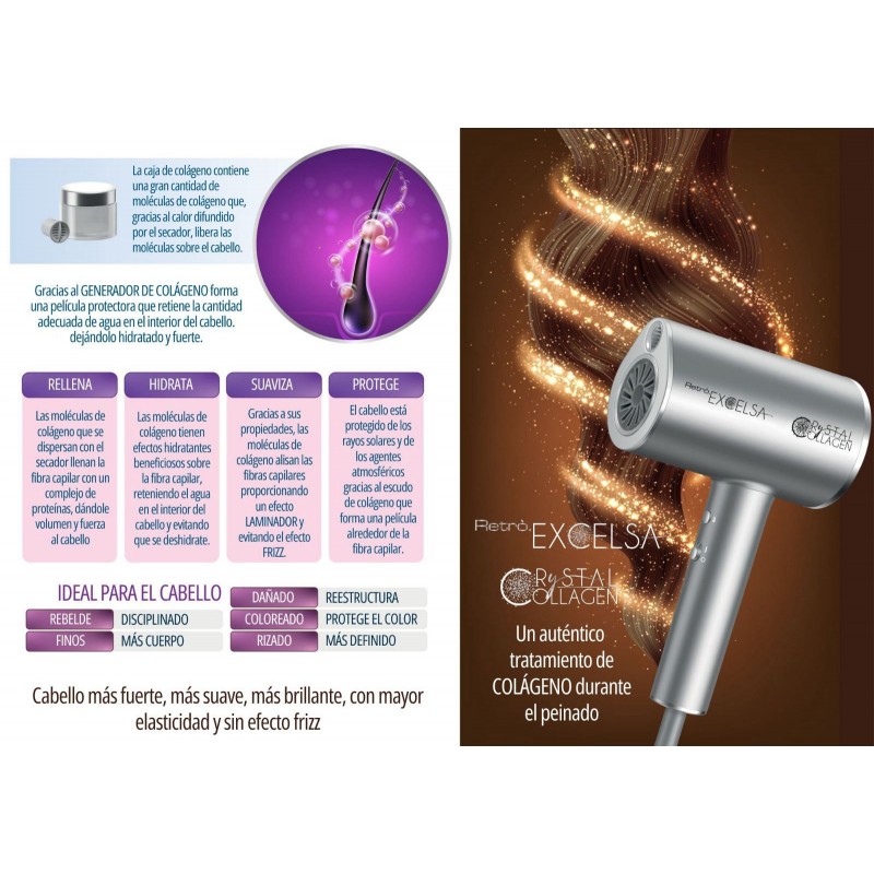 El primer secador que mejora la salud del cabello mientras lo peinas. El Excelsa CRYSTAL COLLAGEN incorpora un innovador generador de colágeno activo que libera una micro-bruma de moléculas que: