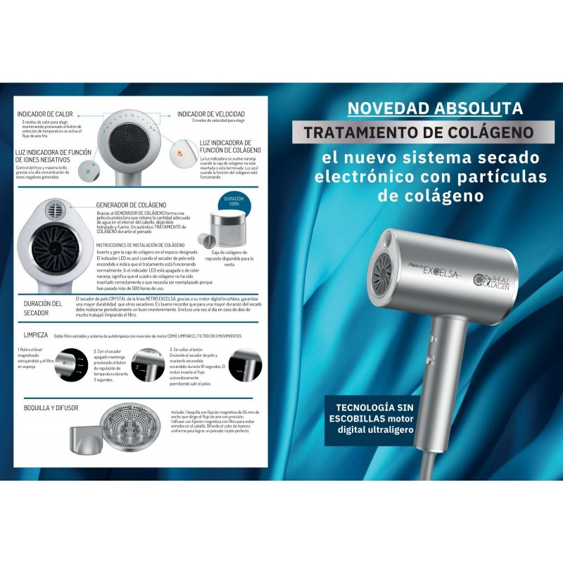 El secador Excelsa CRYSTAL COLLAGEN mejora la salud del cabello mientras lo peinas, hidratando, fortaleciendo y eliminando el frizz con tecnología de colágeno activo.